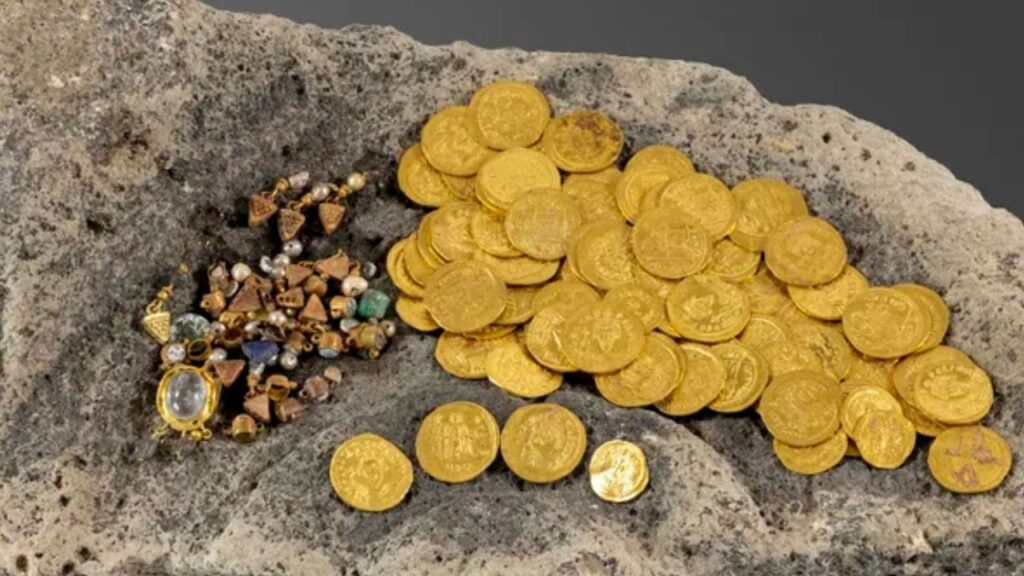 Arkeologlar tarafından yapılan incelemeye göre hazine, 97 saf altın sikke ile inci, yarı değerli taş ve cam süslemelerle işlenmiş çok sayıda mücevher parçasından oluşuyor. Buluntu, Golan Tepeleri’nin eteklerinde yer alan antik Hippos (Sussita) kentinde sürdürülen kazılar sırasında gün yüzüne çıkarıldı.